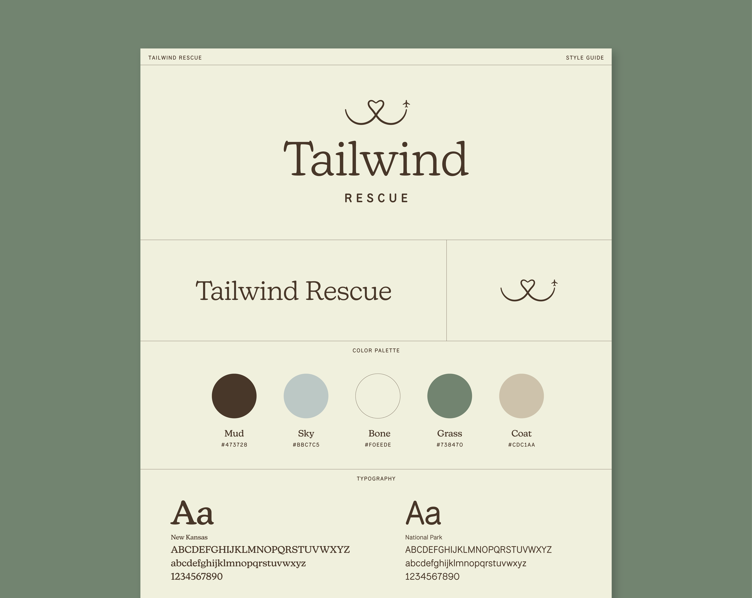 The Mohlman family founded Tailwind Rescue, a 501(c)(3) nonprofit dedicated to saving animals from high-risk shelters and flying them to safe, loving homes. To support their fundraising efforts, I developed a visual identity that reflects the warmth and care at the heart of their work. The logo blends pets, aviation, and compassion into a single icon, with a dynamic flight path and heart-shaped nose. The color palette draws inspiration from pet-friendly environments, using soft hues to evoke feelings of comfort and hope. The friendly nature of the design aims to unite pet lovers and highlight the importance of giving every animal a chance at a better life.
